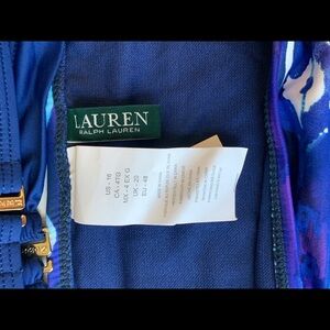 Lauren Ralph Lauren solid blue halter top with beaded accents plus women’s LRL Calypso Ikat print hipster swim bottom. Both size 16.