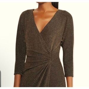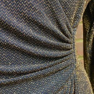 Black and gold metallic knit (88% Nylon, 8% Metallic fibers, 4% Elastane). Gown. 3/4 Sleeves. V-neckline. Hidden back zipper with hook-and-eye closure. Partially lined.
