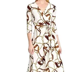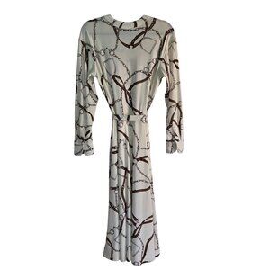 This Lauren Ralph Lauren Black Label dress features a stunning equestrian print with a horse bit chain design. The fit & flare style, V-neck, and faux wrap belted(missing 1 belt loop i think) waist create a flattering silhouette perfect for any occasion.