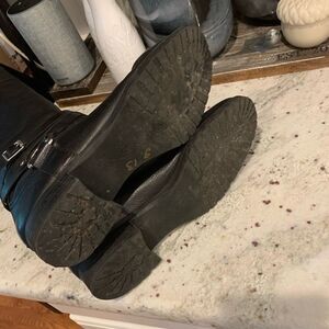 Chic black leather boots with a sleek design. Features a stylish buckle detail. Ideal for versatile wear.