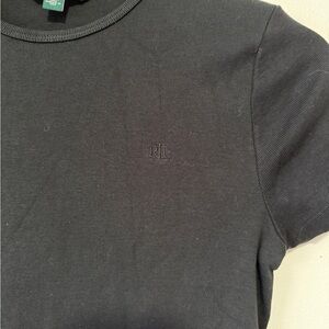 Keywords: Lauren Ralph Lauren, black t-shirt, women's t-shirt, ribbed t-shirt, crew neck, short sleeve, RL logo, casual top, basic tee, wardrobe staple, layering piece, designer t-shirt, size M, cotton blend