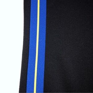 Very good pre-loved condition black pants with blue and yellow stripe down each side size large. Wide elastic drawstring waist and side pockets. Viscose poly spandex blend. See measurements in photos.