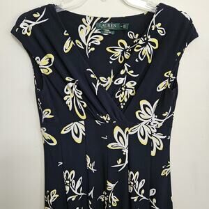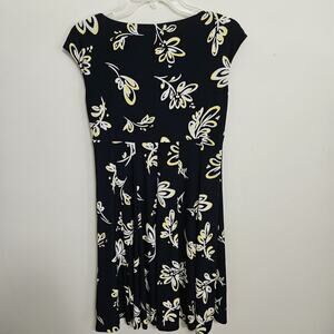 This Lauren Ralph Lauren Black with Yellow and White Whimsical Floral Print Midi Dress in size 4P is a stylish and versatile piece perfect for various occasions such as weddings, parties, workwear, and business events. The sleeveless dress features a flattering v-neckline and a pullover closure, made from a blend of polyester and spandex with a stretchy jersey fabric. The fit and flare style with an empire waist and slimming features makes it both fashionable and comfortable, while the nature-themed floral print adds a touch of whimsy to the classic black color palette. Perfect for the summer, fall, and spring seasons, this dress is a must-have for any woman's wardrobe. Like new condition