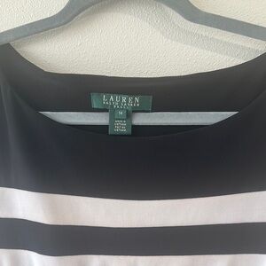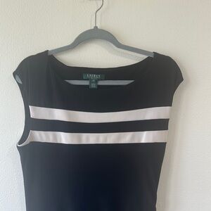 This sophisticated black and white sheath dress by Lauren Ralph Lauren is perfect for a cocktail night out. Featuring a sleeveless design and a classic crew neck, it offers a sleek silhouette with strategically placed white stripes for a flattering fit. The mini length adds a modern touch to this timeless piece.