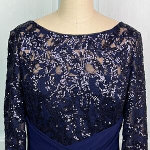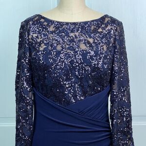 -Navy sequin cocktail dress, features a sequined lace long-sleeve bodice and a ruched jersey skirt.