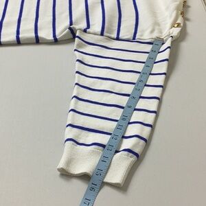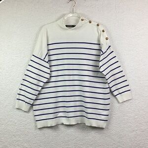 LRL Nautical Blue and White Striped Pullover Sweater. Brass Buttons Accents at the Neckline, 3/4 Sleeves. Cotton / Modal Blend. Very nice condition. Measurements included in photos.