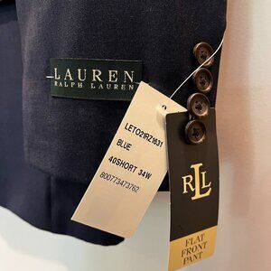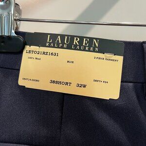 Brand new with tags Lauren by Ralph Lauren navy blue 100% wool suit (Ultraflex). Size of jacket is 40S. Suit jacket pants are 32W (NOT 34W as printed on jacket tag) with unfinished 37"+ inseam. Never worn and kept in garment bag the past several years since purchased (gift).