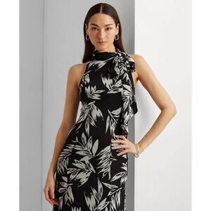 This elegant Lauren Ralph Lauren Botanical Evening Gown is perfect for your next special occasion! It features a beautiful black-and-white floral print on flowing georgette fabric. The flattering silhouette and chic neck-tie detail add to its timeless appeal.