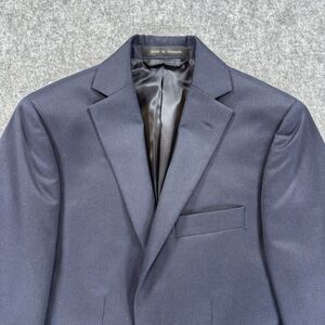 This listing is for a boys' suit jacket/blazer from Lauren by Ralph Lauren in a classic navy blue color. The blazer is in excellent pre-owned condition and features a two-button closure with a notch lapel. The fabric is a durable and comfortable blend of 65% polyester and 35% rayon. The jacket is fully lined with a silky black lining and includes multiple pockets.