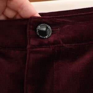 Burgundy stretch velvet – Straight leg – Five-pocket design – Black decorative button – Mid-rise – Zip fly closure