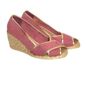Lauren Ralph Lauren Cecilia espadrilles Jersey look like linen pink light purple look size 9 Espadrille wedge peep-toe opening and gold leather crisscross vamp straps Jute-wrapped midsole measures are approximately in inches heel 2.5” has small spot shown in picture and video Does not affect overall look reflected in price offers welcome