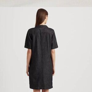 Elegant charcoal mini dress. Features short sleeves and a classic collar. Ideal for versatile styling.