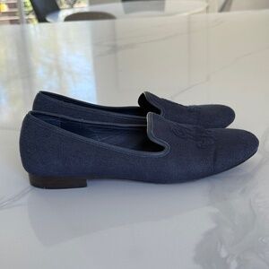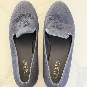 Classic navy embroidered slip-on loafers with the Ralph Lauren logo. These shoes combine effortless elegance with everyday comfort.
