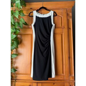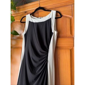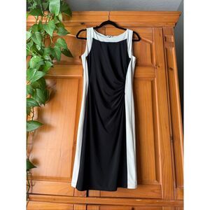 Elevate your wardrobe with this stunning Lauren Ralph Lauren sheath dress in women’s size 8. Designed with a classic black and white colorblock pattern, this dress features a sleek boat neckline, ruched side detailing, and a flattering stretch fit that enhances your silhouette. The sleeveless design makes it perfect for layering or wearing alone through any season.