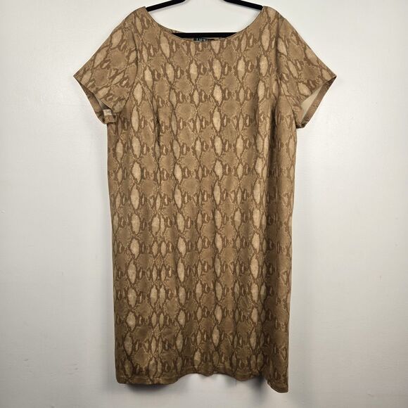 Lauren Ralph Lauren dress, plus size 3X shift dress, snake print bodycon, brown animal print sheath, viscose stretch dress, office workwear, classic pullover dress, short sleeve 3X, women's plus dress, fall fashion, career, office