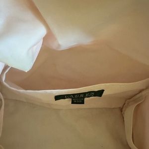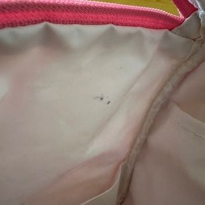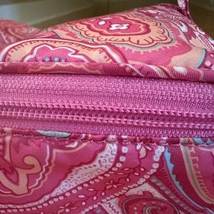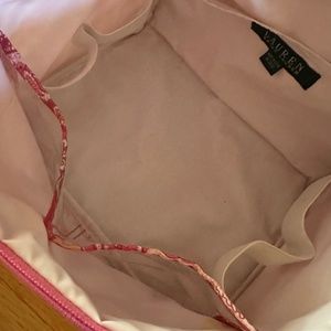 Lauren Ralph Lauren Cosmetic Case Travel Case Train Case Pink Paisley. Pretty pink paisley print exterior. Top carrying handle. Zip around top opening. White vinyl interior with two clear slip pockets on one side and opposite side has one long slip pocket with Lauren Ralph Lauren label on the front of it. Each end has two elastic grips to hold bottles upright. Clean interior and exterior. No holes or tears in the interior white vinyl. Two very small black ink dots on one end of the interior (see last pic.) Excellent condition.