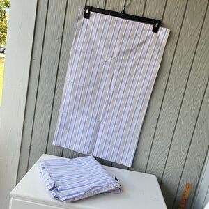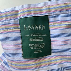 Lauren Ralph Lauren 100% cotton sheet set featuring soft pastel stripes in blue, pink, yellow, and white — a timeless, upscale pattern from the early 2000s Ralph Lauren Home collection, made in Bahrain. Known for its preppy yet classic aesthetic, this line has become increasingly collectible as Ralph Lauren’s older cotton bedding patterns have been discontinued.