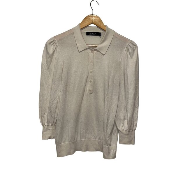 Lauren Ralph Lauren Cream Puff Sleeve Collared Knit Sweater Medium Womens