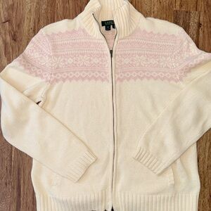 Beautiful cream sweater with pink Fairisle design. Features a full zip-up style, 2 slant front pockets, Ribbed cuffs, collar and sleeves
