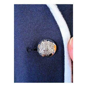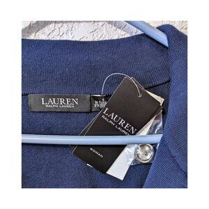 A polished, preppy classic with timeless Ralph Lauren elegance, this Lauren by Ralph Lauren blazer-style jacket features a rich navy knit body with crisp white piping, silver crest buttons, and an embroidered RL shield.