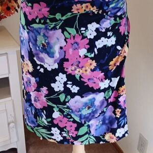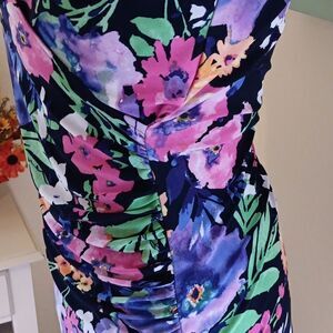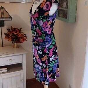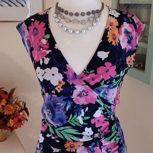 Pretty wrap front dress in a dark floral. Ruching at left waist for a flattering look. Double layer of fabric on the skirt. Cap sleeves, pull over style. Size PS measures 38 at chest, 30 at waist, 38 at hips, 40 long from shoulder to hem. I love this classic shape, and beautiful colors.