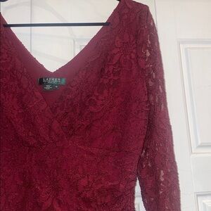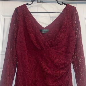 Stylish deep red dress with intricate lace details. Ideal for elegant events.