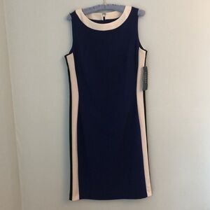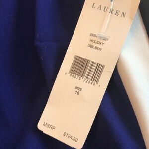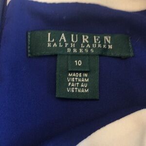 Here is a Lauren Ralph Lauren Dress Holiday NWT Size 10 Classic style, fully lined, the colors is blue with white and black inserts