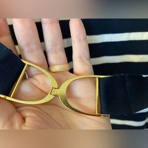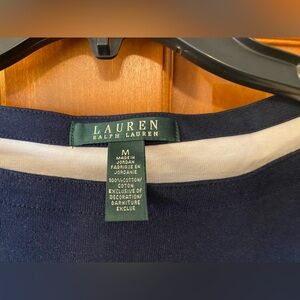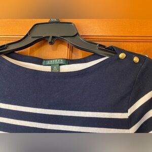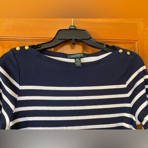 Lauren Ralph Lauren Dress Medium Blue White Striped Knit Gold Buttons Belt