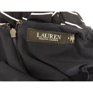 This Lauren Ralph Lauren dress in size 6 features blue and white stripes with 3/4 sleeves and a flattering v-neckline. The faux wrap design creates a fit and flare or a-line style, depending on how it's worn. The colorful striped pattern adds a playful touch, making it perfect for any occasion.j