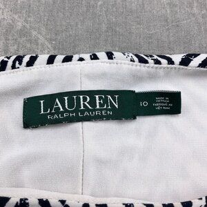 Lauren Ralph Lauren dress in black and white chevron colorblock pattern. Size 10 with a flattering fit and flare style, crafted from stretch polyester for comfort and elegance.