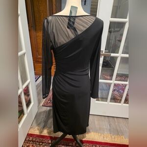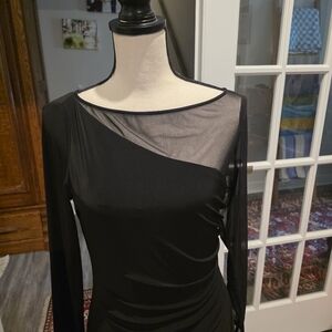 Sophisticated black dress with sheer long sleeves. Asymmetrical neckline adds a modern touch. Perfect for evening events.