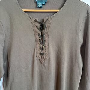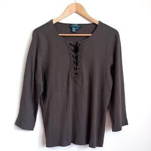 100% Cotton 3/4 Sleeve Lace Up Fitted Victorian Old Money Women's Lauren Ralph Lauren Knit Top Shirt