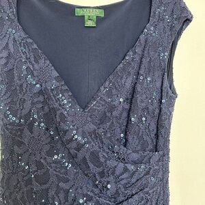 Elevate your evening look with this stunning Lauren Ralph Lauren gown! This elegant dress features a beautiful navy blue lace overlay adorned with subtle sequins that shimmer with every movement, perfect for any formal event. The dress boasts a flattering draped V-neckline and cap sleeves, offering both comfort and sophistication.