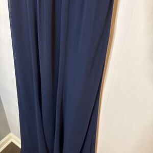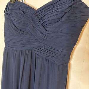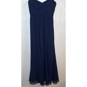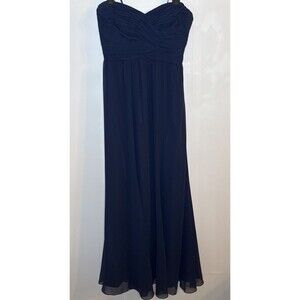This Lauren Ralph Lauren Evening Gown is a stunning navy blue maxi dress featuring a sweetheart neckline and a ruched bodice. Made from chiffon fabric, this strapless gown has a flattering empire waist and a pleated design, perfect for formal occasions like weddings, prom, senior ball or parties. The dress is lined, lightweight, and designed to be slimming, making it a great choice for a glamorous and elegant look. This dress exudes classic and designer elegance fit for a special event.