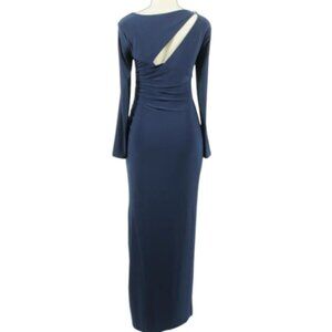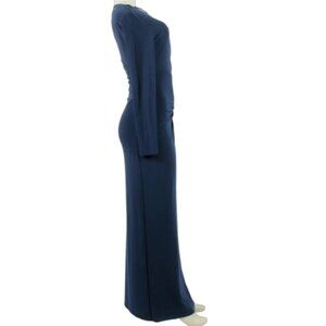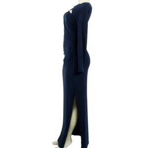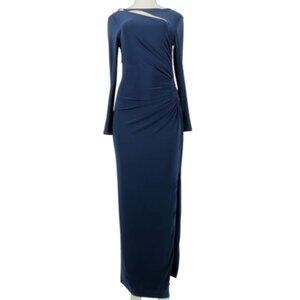 Navy Blue Lauren Ralph Lauren Evening Long Sleeve Gown with keyhole, embellished brooch, and asymmetric shirring.