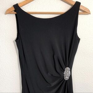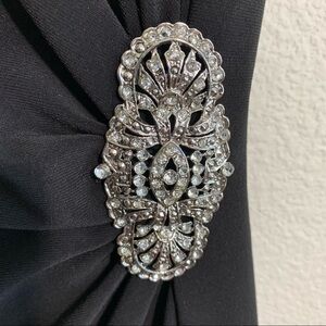 Stunning rhinestone brooch gathers the waist and creates a flattering draping effect. Perfect for a cocktail party or work event.