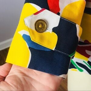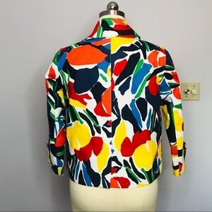 Make a statement in this bright and colorful jacket! Oversized floral print. Gold metal Lauren Ralph Lauren buttons. Navy blue liner. Vented back. Zig zag stitch pattern on underside of collar. Buttons on cuffs. Two front working pockets. Fabric is heavy. Small spot (pictured). Wear as a blazer or a lightweight jacket. Perfect for the office!