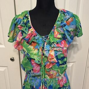 NWT Gorgeous tropical print dress. V neckline with self tie and ruffled trim. Flutter sleeves. Elasticized waist creates a blouson effect. Shirring into waist and tiered seams. Tiered skirt. Fully lined except for sleeves. Size 2 Color Blue Floral 17” PTP, 13” waist & 46” L Polyester *belt in stock photo not included