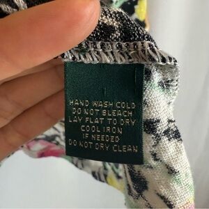 A vibrant and airy Lauren Ralph Lauren top, perfect for adding a pop of color to your wardrobe. top features a beautiful floral print in shades of pink, orange, green, and yellow against a black and white background. The top has a comfortable, relaxed fit. Note there is a small hole under the left armpit, please see pictures for details.
