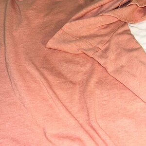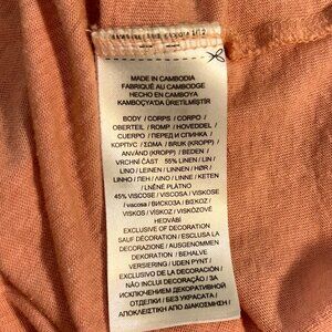 DESCRIPTION Lovely jersey peasant top with flutter sleeves in a deep rosy peach color by Lauren Ralph Lauren. Drapes beautifully, loose flowing fit, tassel tie split neck. Linen/Viscose blend. Machine wash gentle. Peach color.