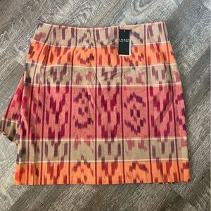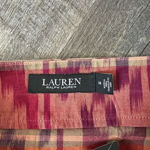 This listing is for a NWT's Lauren Ralph Lauren Geometric Motif Cotton Linen Wrap Skirt in size 14. Rendered in a lightweight blend of cotton and linen for a soft hand, this skirt is defined by an easy wrap silhouette with a ruffle at the waist. It’s yarn-dyed with one of the season’s patterns inspired by ikat weaving techniques traditional to India, which typically feature geometric motifs formed by a combination of stripes and chevrons.