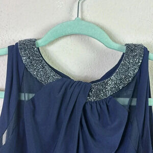 This beautiful Ralph Lauren evening gown in size 14 is dark royal blue. The rhinestone neckline will wow. It is a sleeveless and stretchy maxi dress.