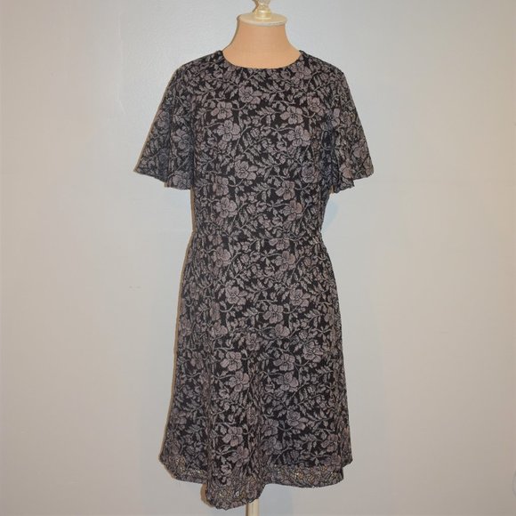 Lauren Ralph Lauren Gray and Black Lace Dress. Fully lined (except sheer sleeves) gray and black floral print lace A-line dress with invisible back zipper. Bust: 19”, waist: 16”, length: 39”. 100% polyester. NWT.