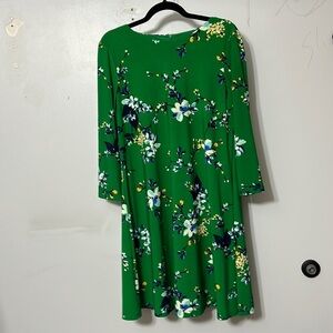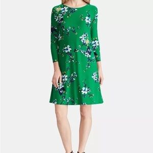 This stunning Lauren Ralph Lauren dress features a vibrant green base with a beautiful floral print in white, navy, and yellow. Crafted from a soft stretch fabric blend (95% polyester, 5% elastane), it offers a flattering drape and comfortable fit. The dress has a timeless silhouette with long sleeves and a flowy knee-length hem—perfect for spring events, garden parties, or the office.