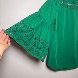 Lauren Ralph Lauren Green Poplin Laser Cut Bell Sleeve Top Size Large