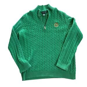 Heritage Lauren Ralph Lauren green cable knit quarter-zip pullover sweater in 100% cotton. Made in Australia, RN 54050. Great for St. Patrick's Day, fall layering, holiday events, preppy campus style, or schools with green as a team color. Features embroidered crest patch at chest, ribbed hem/cuffs, and cozy mid-weight knit. Unisex look—style with denim, cords, or wool skirts.
