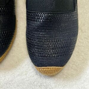 Adorable Lauren Ralph Lauren branded Helma Espadrille style sandals in a classic black color with a tan rope/twin like trim wedge heel, slip on slingback style with bow accent on back, rounded closed toe, cushioned, appx 3in block heel, 100% cotton lining/cotton + poly upper.