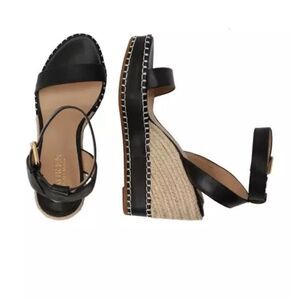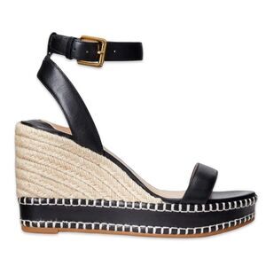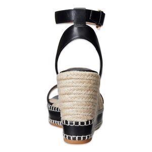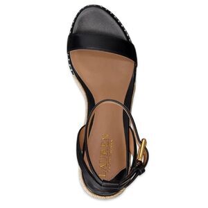 100% leather upper with jute heel and stitching. Rubber sole. Gold buckle ankle strap with signature “lauren” on buckle.