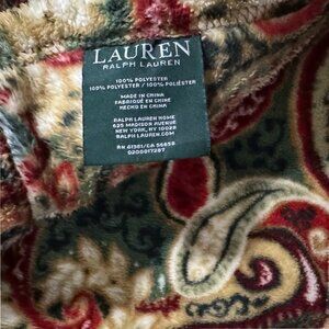Luxurious Lauren Ralph Lauren Home fleece blanket in a richly detailed paisley pattern with tones of red, green, gold, and ivory.