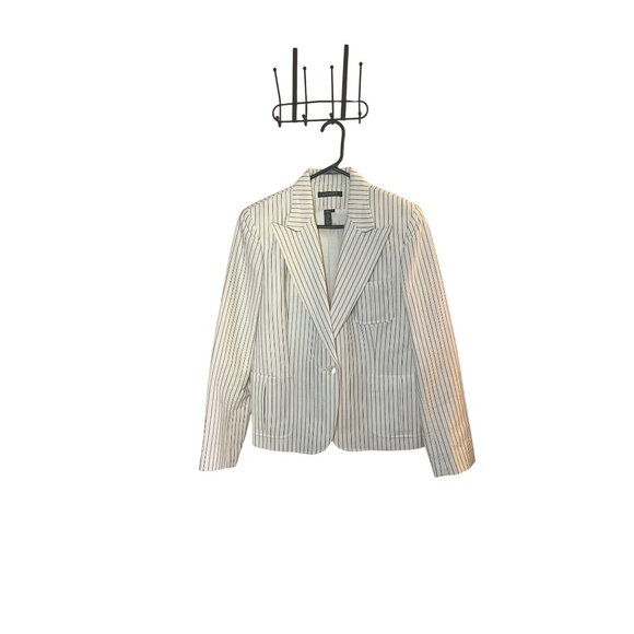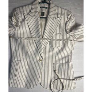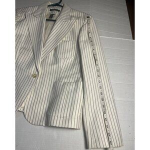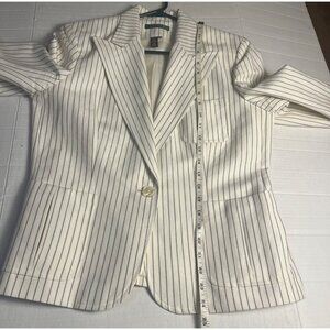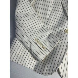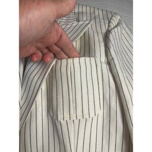This tailored ivory pinstripe blazer offers a sophisticated look for professional settings. Made with a linen blend, it's fully lined for added structure. four buttons at the cuffs. excellent preowned condition, no rips holes or stains. 70% linen, 30% cotton. See photos for approximate flat measurements. Preppy, academia, Office.